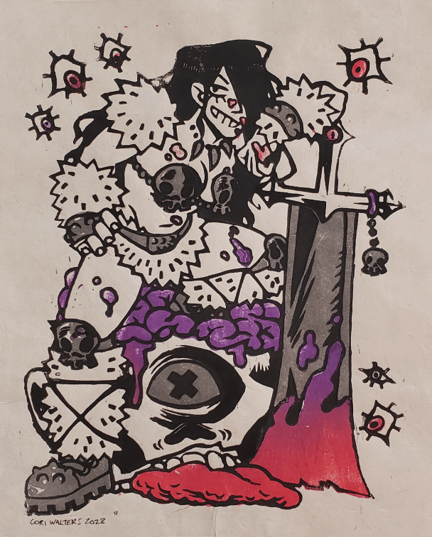 Dark Knight is printed in black, violet, red, fluorescent magenta, and metallic silver inks on lokta paper.