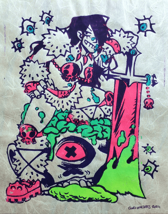 Dragonfruit is printed in violet, fluorescent magenta, fluorescent blue, and fluorescent lime inks on unryu paper.