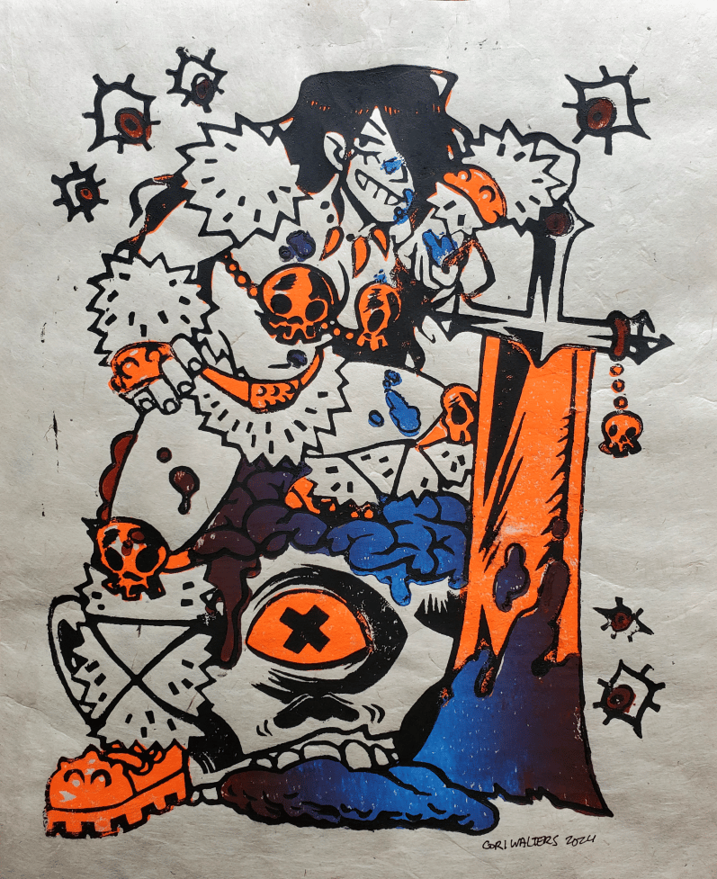 Ectoplasm is printed in black, fluorescent lime, and turquoise inks on lokta paper.